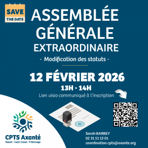 La Communauté Professionnelle Territoriale de Santé Axanté organise une Assemblée Générale Extraordinaire le jeudi 12 février 2026, de 13h à