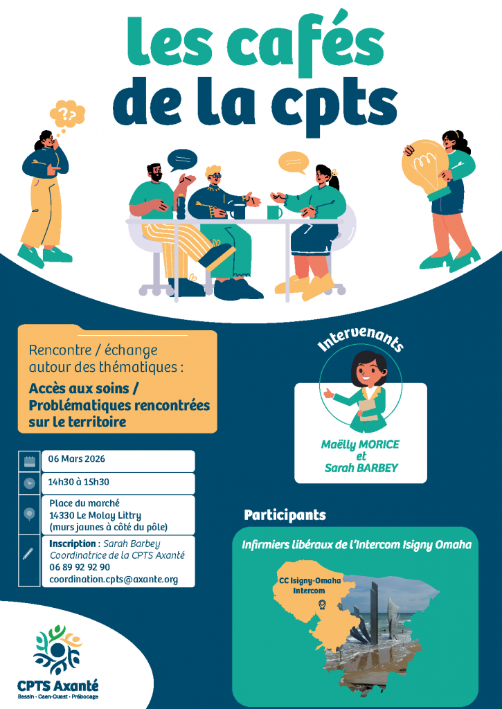 La CPTS Axanté organise un nouveau temps d’échange convivial : Les Cafés de la CPTS, un rendez-vous pensé pour favoriser le dialogue entre professionnels de santé autour des enjeux du territoire. Ce prochain Café de la CPTS est destiné aux infirmiers libéraux de l’Intercom Isigny Omaha.